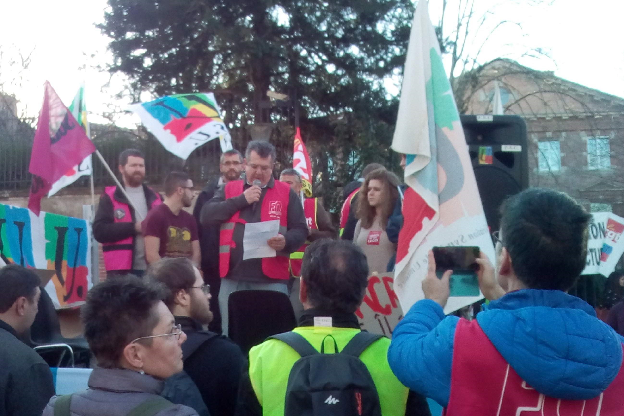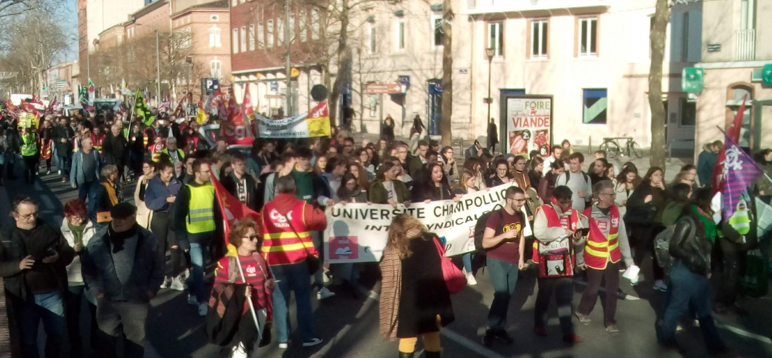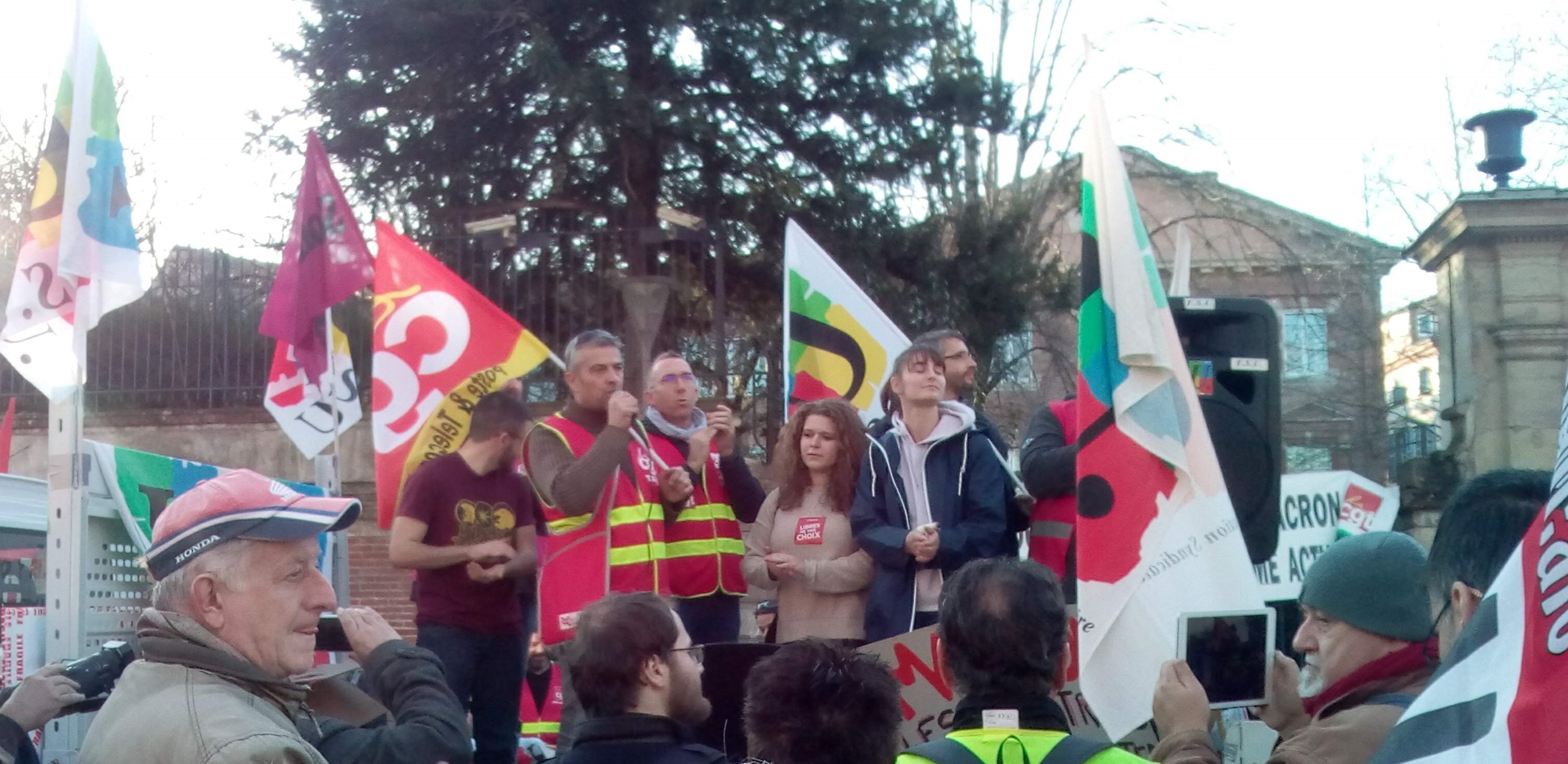 La grande nouveauté de la journée c’est l’entrée en nombre des jeunes dans la mobilisation. Après une première Assemblée générale de la fac Champollion la semaine dernière, l’AG réunie ce midi a voté la grève et la tenue d’une prochaine AG mercredi à 14 H pour reconduire la grève. Les étudiants avec les enseignants et des grévistes de différents secteurs (cheminots, Education nationale) ont commencé à intervenir dans les amphis pour inviter l’ensemble des étudiants à rejoindre la grève. Un cortège d’une centaine est parti de la fac et a rejoint la manifestation interprofessionnelle.