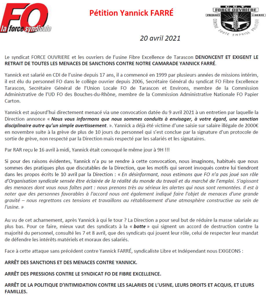 Elu du personnel FO dans le collège ouvrier depuis 2006, Secrétaire Général du syndicat FO Fibre Excellence Tarascon, Secrétaire Général de l’Union Locale FO de Tarascon et Environs, membre de la Commission Administrative de l’UD FO des Bouches-du-Rhône, membre de la Commission Administrative Nationale FO Papier Carton, Yannick est menacé de sanction par la Direction de l’usine Fibre Excellence.